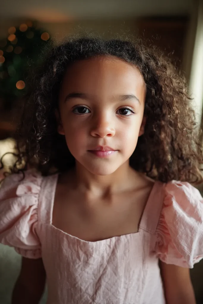 This flower girl is wearing a soft blush pink dress with sweet puff sleeves and a simple square neckline that feels classic and youthful. The fabric has a light texture that adds interest without looking fussy, and the soft pastel shade flatters beautifully in warm indoor light. Her natural curls are worn loose around her face, and the overall look feels clean and understated with no extra accessories needed.