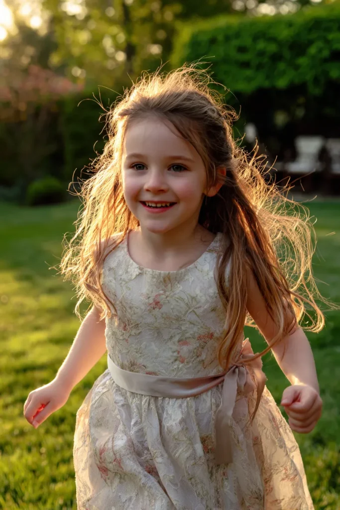 This flower girl is wearing a soft ivory lace dress with a subtle floral pattern woven throughout the fabric. The sleeveless design keeps it light and easy, while a satin ribbon tied at the waist adds a sweet finishing touch. Her hair is pulled back loosely with natural flyaways catching the sunlight, and her bright smile brings the whole look to life as she moves across the lawn.