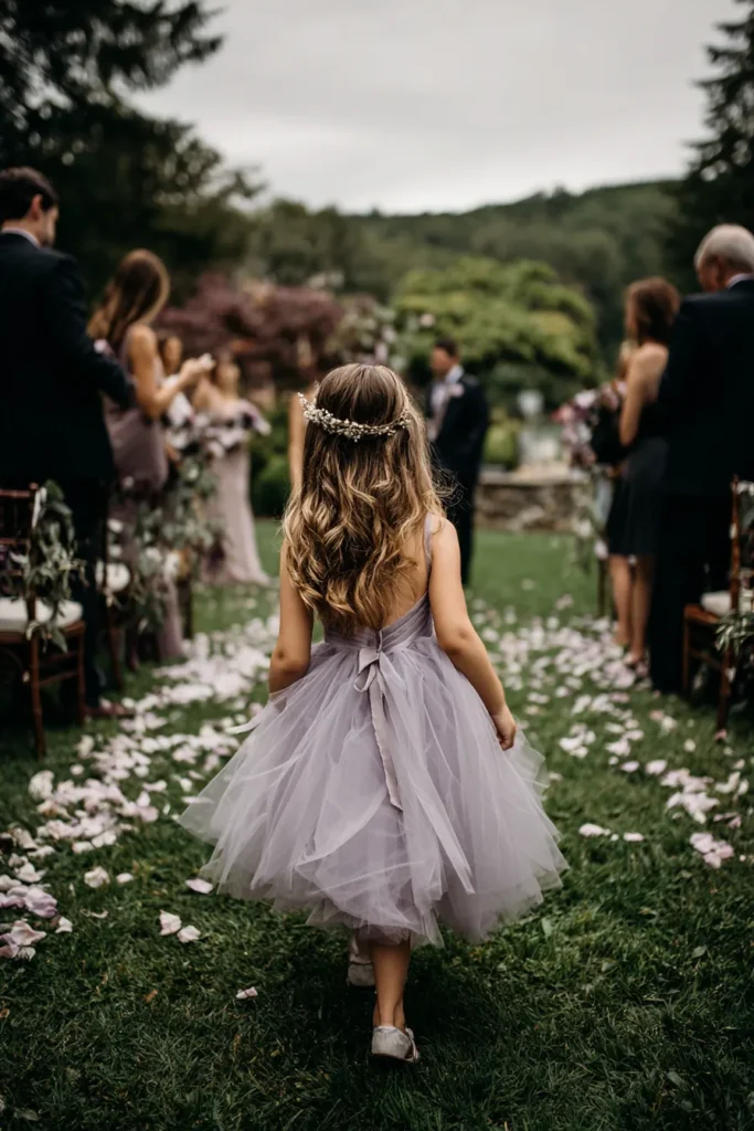 This flower girl is wearing a soft dusty lavender tulle dress with a full layered skirt that creates a beautiful airy shape as she walks down the aisle. The dress ties neatly at the back with a delicate bow, adding a sweet detail that looks lovely from every angle. Her hair falls in loose waves down her back, finished with a subtle floral crown that feels natural and perfectly suited for an outdoor ceremony. Petals scattered along the grass and guests lining the aisle make the whole scene feel warm and intimate.