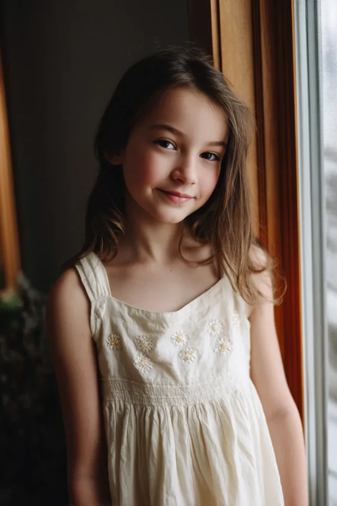 This flower girl is wearing a gentle ivory dress with delicate embroidered floral details scattered across the bodice. The sleeveless cut keeps the look light and comfortable, while the softly gathered skirt falls in an easy, natural way. Her hair is worn loose with a simple side part, and the warm window light brings out the creamy tones of the fabric and the subtle texture of the embroidery.