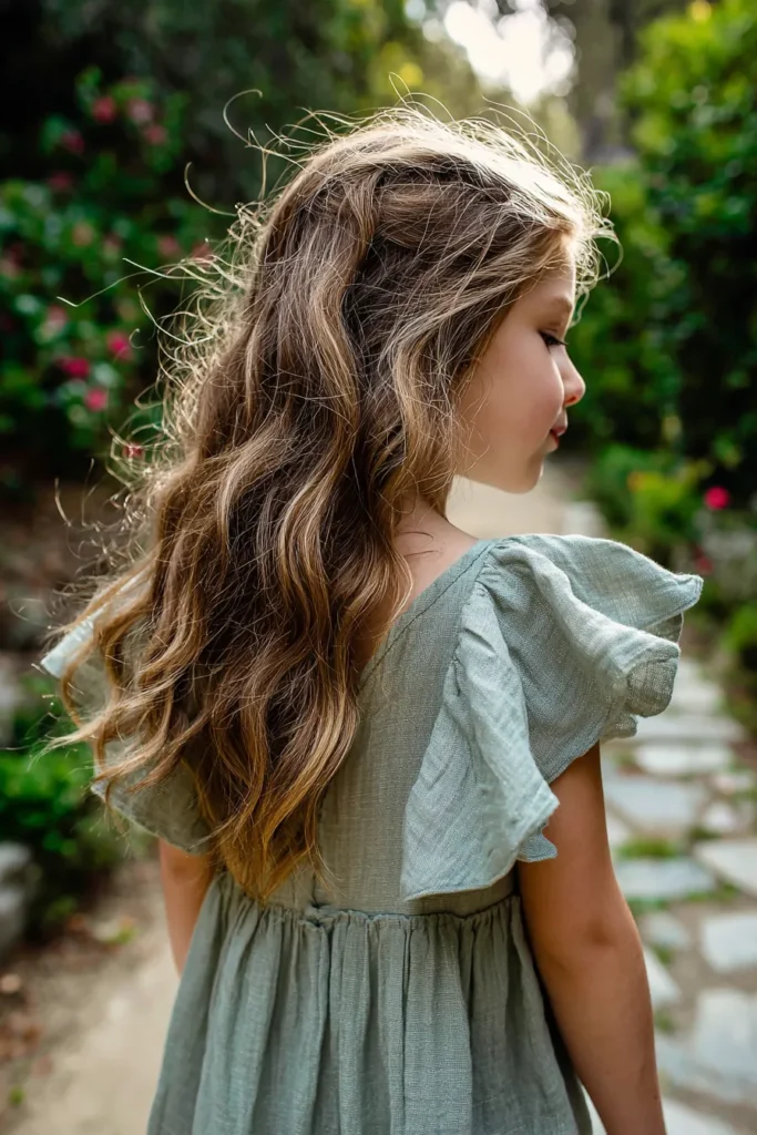 This flower girl is wearing a soft sage green dress with airy flutter sleeves and a gently gathered skirt that falls beautifully as she walks along the garden path. The fabric has a natural texture that feels light and breathable, perfect for an outdoor spring celebration. Her hair is worn long and loose with soft waves and a subtle braid woven in, giving the look a relaxed and natural finish that blends effortlessly with the greenery around her.