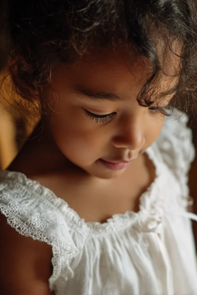 This flower girl is wearing a delicate white dress with lace trimmed straps and a gently gathered neckline that feels light and airy. The fabric drapes softly across her shoulders and chest, creating a romantic texture without any stiffness. Her natural curls frame her face beautifully, and the close up moment captures that quiet sweetness that feels so fitting for a spring wedding day.
