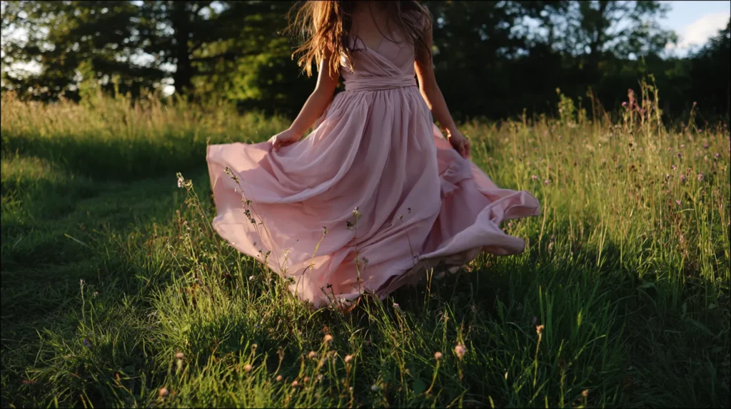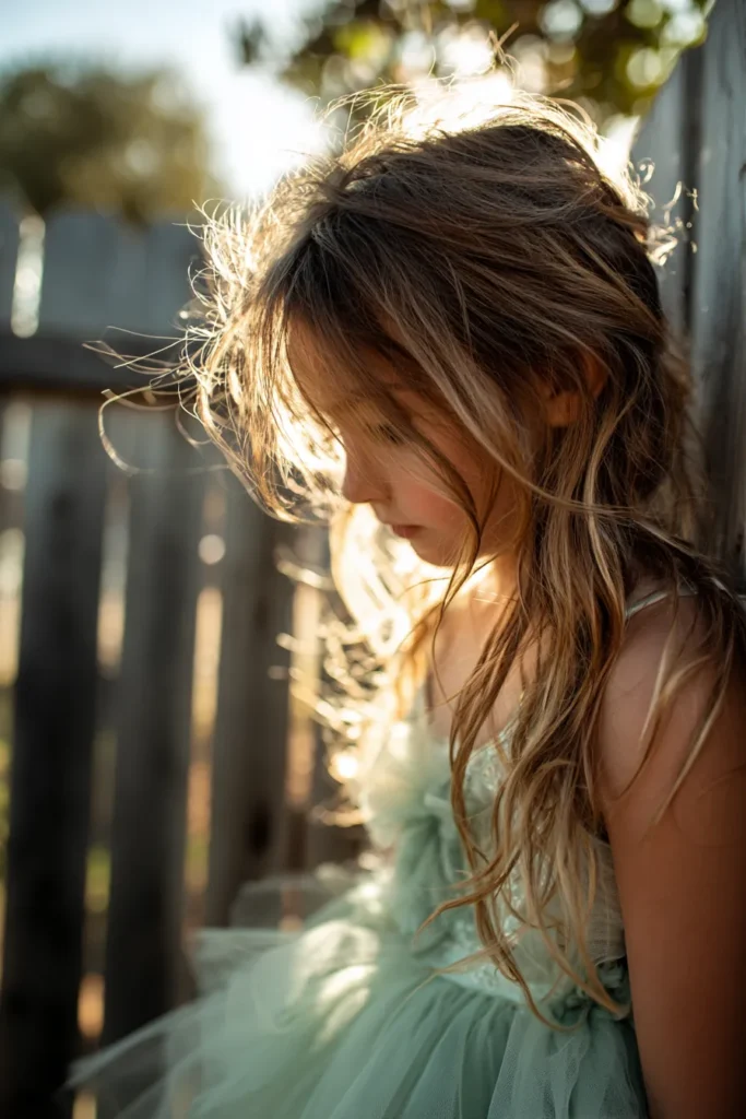 This flower girl is wearing a soft mint tulle dress with a gently gathered skirt that feels light and floaty. The bodice is simple and comfortable, letting the airy layers of tulle create most of the movement and texture. Her hair falls in loose sun kissed waves around her face, and the warm evening light highlights every strand, giving the whole look a dreamy outdoor feel.