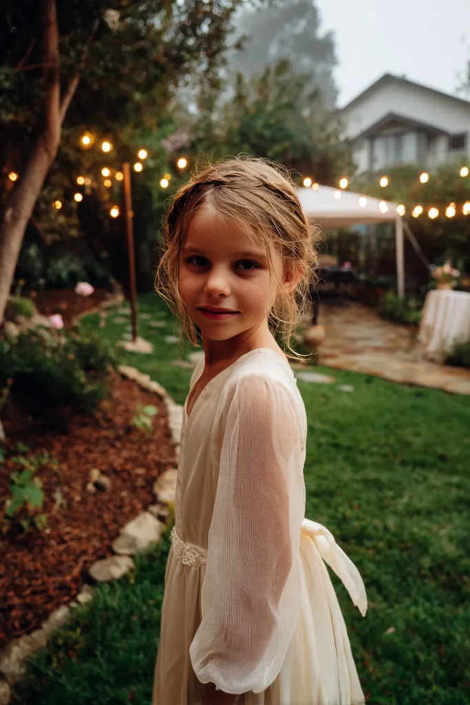 This flower girl is wearing a soft ivory dress with sheer long sleeves and a gently flowing skirt that feels light and elegant. The dress ties at the back with a simple ribbon that adds a sweet finishing detail without stealing attention. Her hair is styled in a loose braided crown that keeps everything neat while still feeling natural. The garden setting glows with string lights in the background, creating a cozy spring evening atmosphere.
