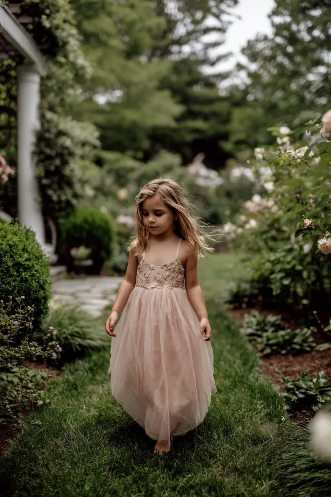 This flower girl is wearing a soft blush tulle dress with delicate floral detailing across the bodice and thin straps that keep the look light and airy. The skirt falls in gentle layers that move beautifully as she walks along the garden path. Her hair is worn loose and slightly tousled, adding to the effortless feel. Surrounded by blooming roses and lush greenery, the dress blends perfectly into the romantic outdoor setting.