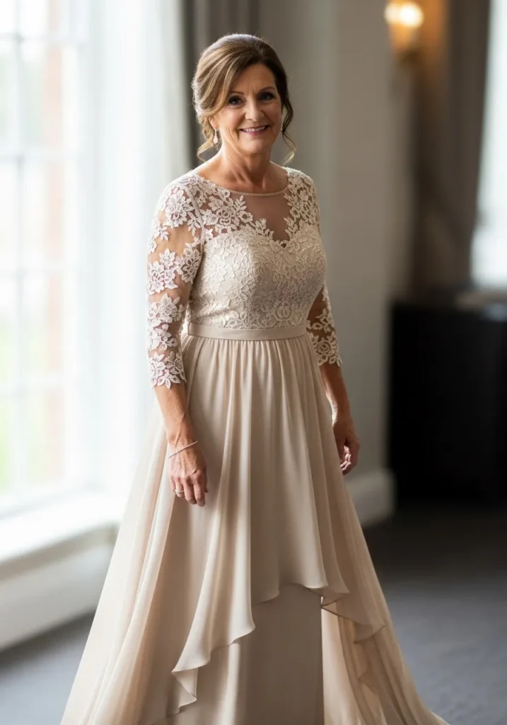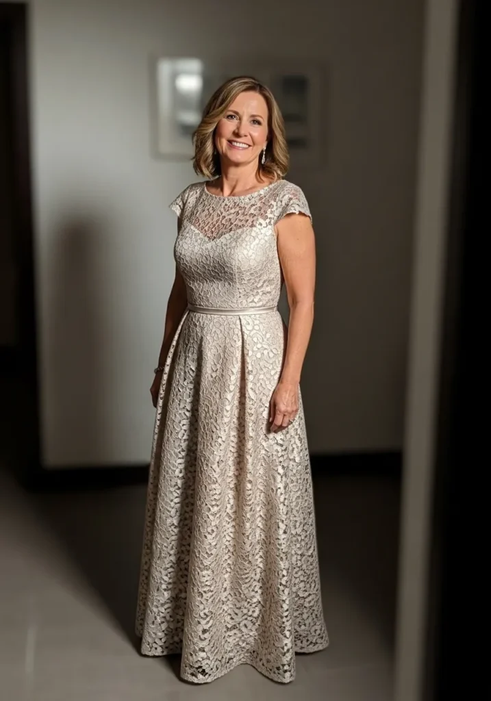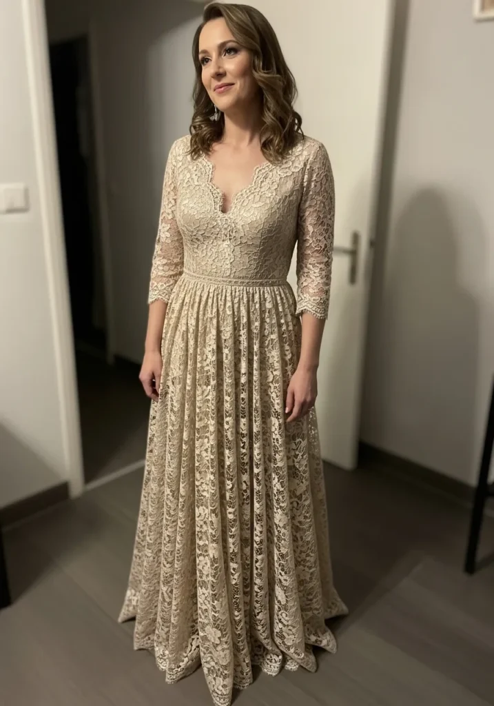 I love how this dress blends classic lace with soft movement, creating a look that feels timeless but not heavy. It’s such a dreamy option for mothers who love romantic textures and soft neutral tones.
