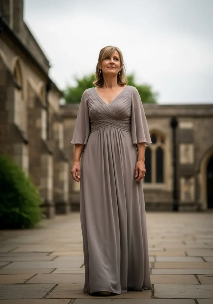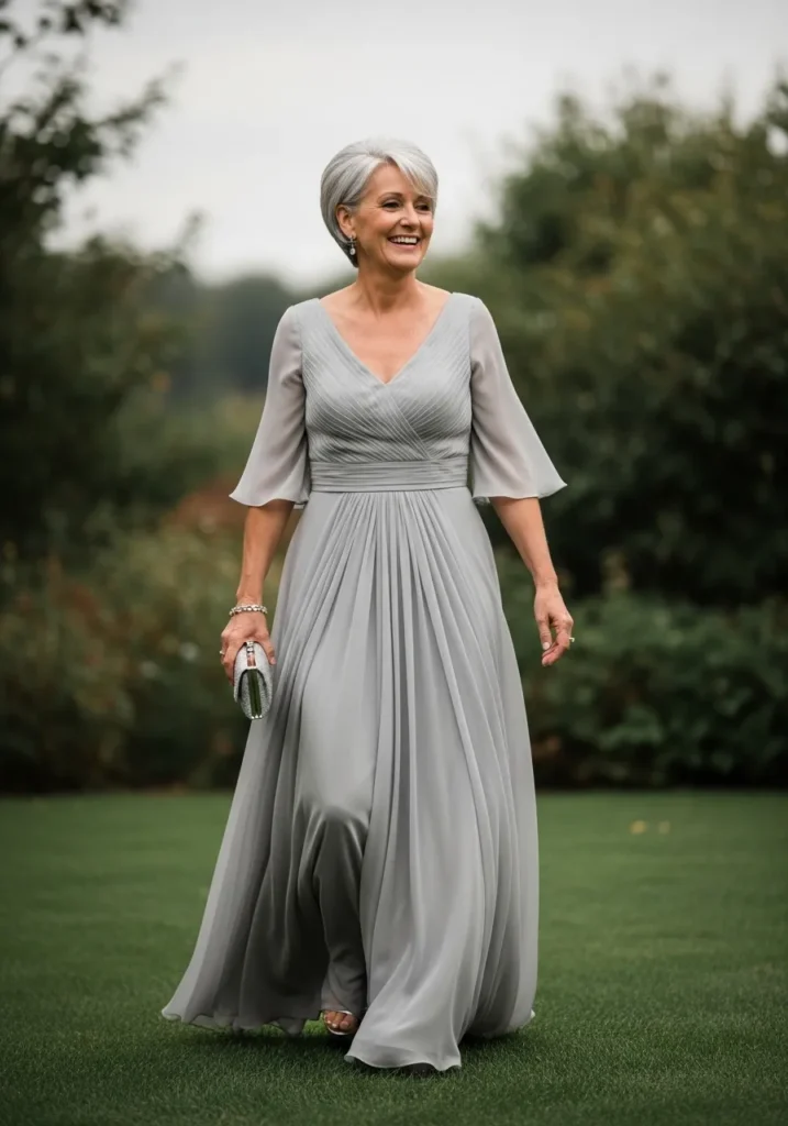 This light gray chiffon gown features airy flutter sleeves, a softly draped bodice, and a flowing floor-length skirt that moves gracefully in the breeze. The light fabric and gentle color give the entire look a soft, ethereal quality that feels fresh and effortless.