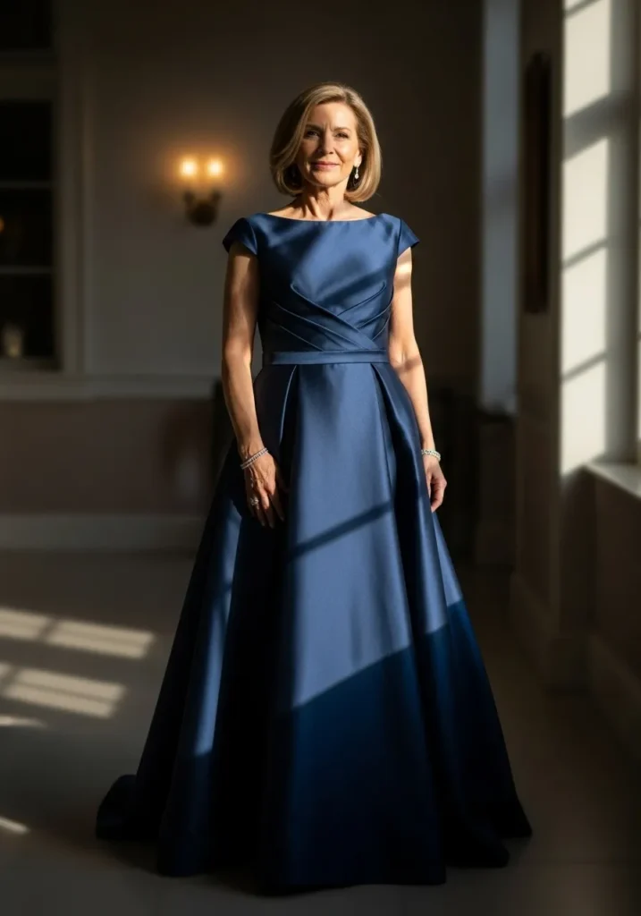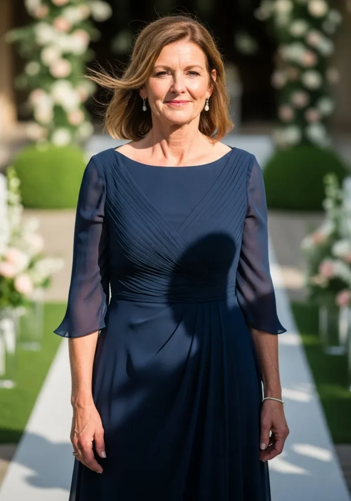 I always find navy to be one of those foolproof colors that looks stunning in photos and flattering on every skin tone. This style feels classic, confident, and wonderfully elegant, making it such a strong choice for mothers who want a truly timeless look.