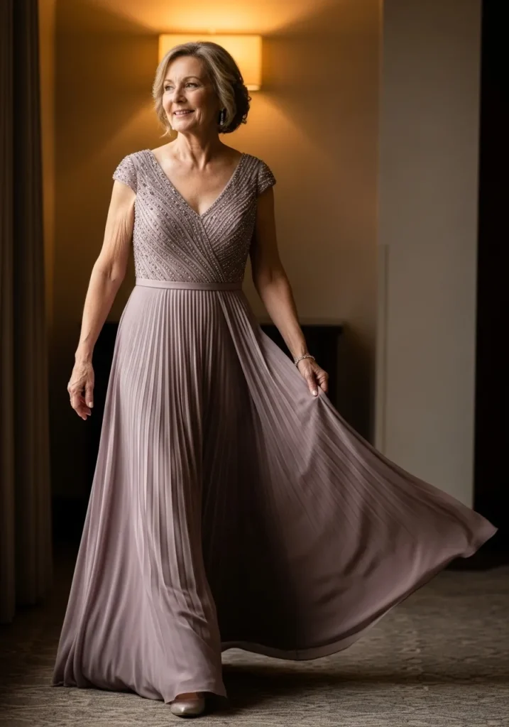 This taupe pleated gown features a softly draped neckline, gentle pleats throughout the skirt, and a relaxed silhouette that feels both elegant and wearable. The neutral tone allows the texture and movement of the fabric to shine without overwhelming the overall look.