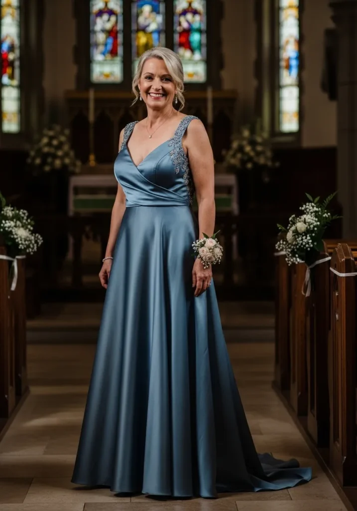 This dusty blue satin gown features a draped bodice, structured waist, and flowing skirt that creates a beautifully elegant silhouette, set inside a softly lit church aisle. The smooth satin fabric adds a luxurious touch while the muted blue tone keeps the look refined and classic.