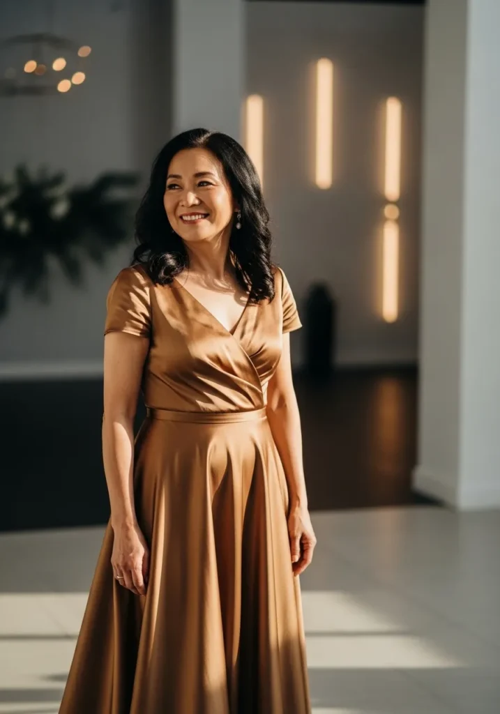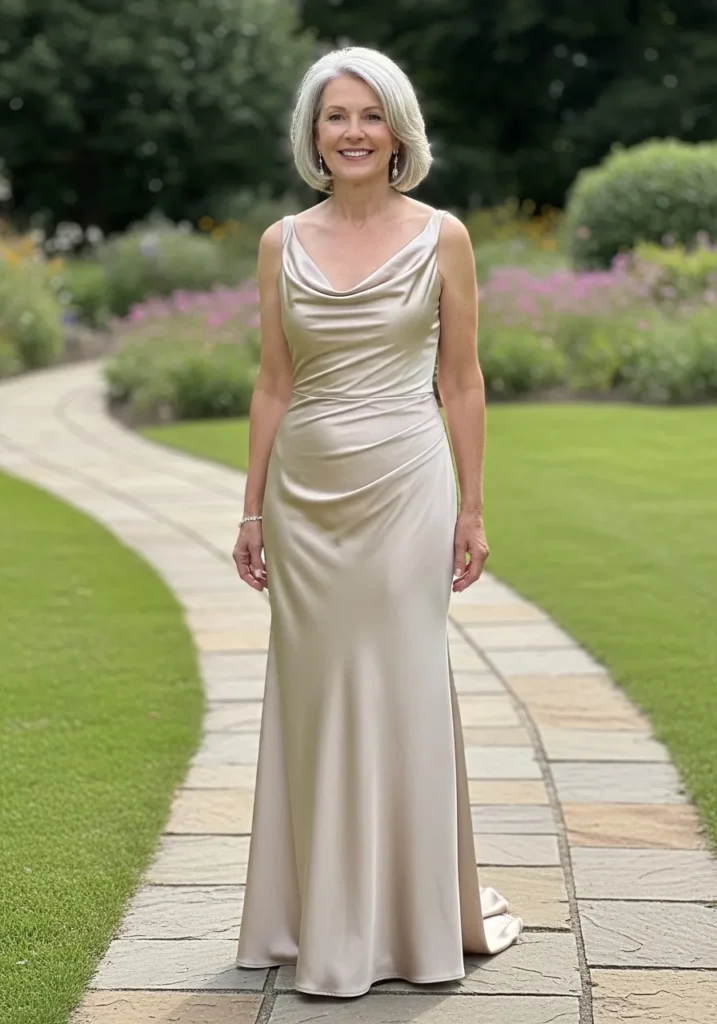 I’m always drawn to simple satin gowns like this because they never go out of style and always look effortlessly chic. This one feels graceful, confident, and perfect for mothers who love a clean, classic aesthetic.