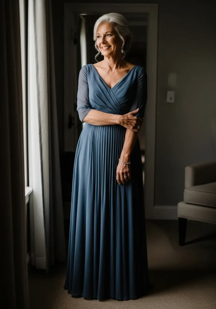 Slate Blue Pleated Gown with Soft Wrap Bodice