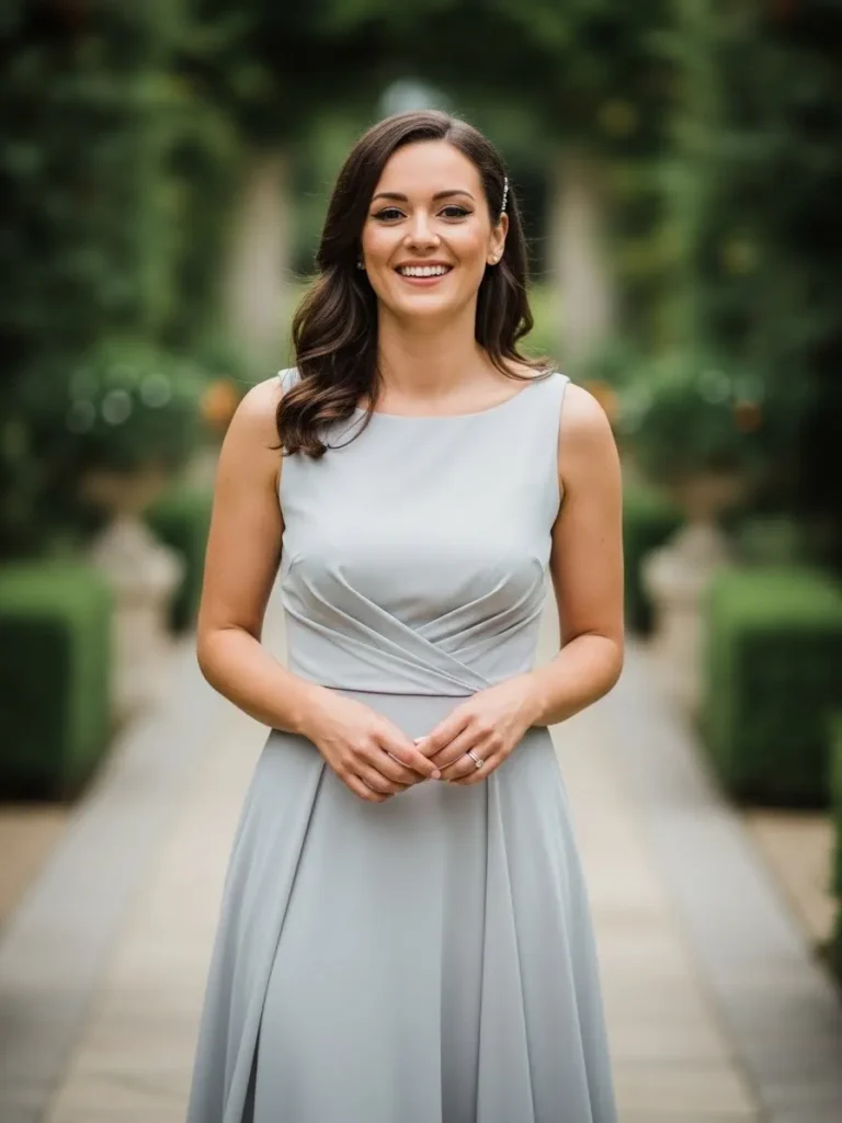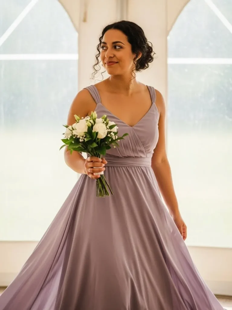 I am such a fan of dresses like this for outdoor weddings. The movement adds elegance without stiffness, and the color feels peaceful and flattering. It is the type of dress that looks just as good in candid photos as it does standing still.
