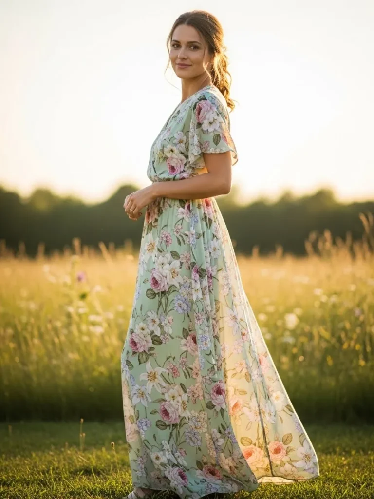 This outfit showcases a floral maxi dress with a light base and scattered pastel blooms. The fitted bodice and flowing skirt create a gentle shape that feels perfectly suited for an outdoor ceremony in a field or garden setting.