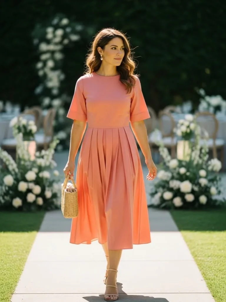 I really love coral for summer weddings because it feels cheerful and confident. This kind of dress stands out in the best way without stealing focus. It feels fun, flattering, and perfect for a sunny celebration that lasts all afternoon.