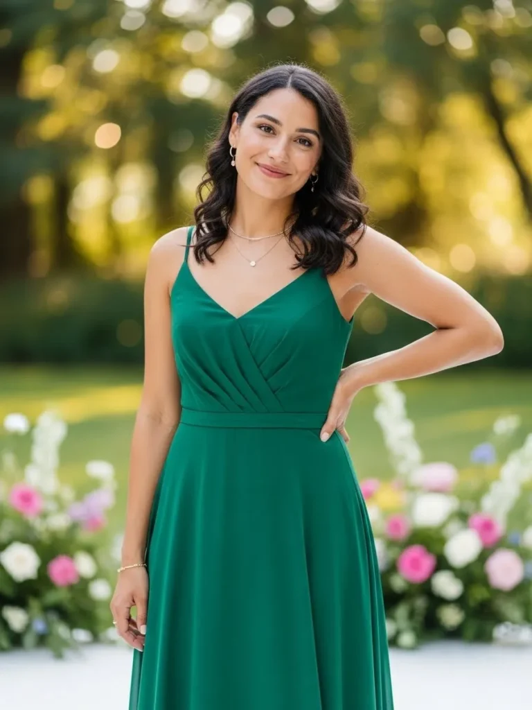 Sage green always feels calm and elegant to me. It blends beautifully with outdoor settings and feels very timeless. This is the kind of dress that looks graceful from every angle.