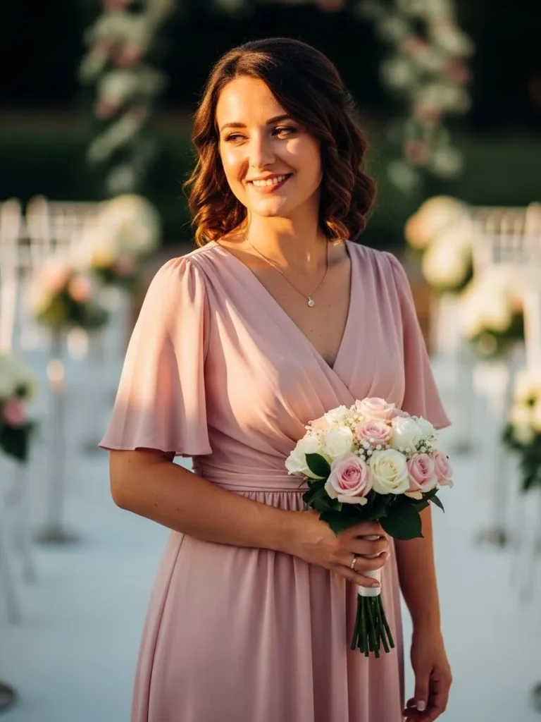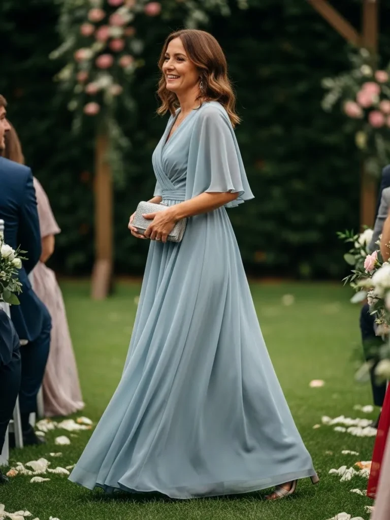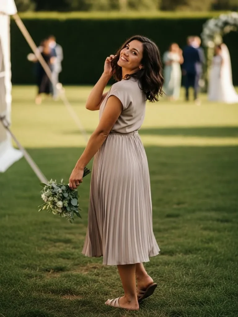 I always find this kind of dress incredibly graceful for summer weddings. The color is subtle but still special, and the flowy fabric adds instant elegance without feeling overdressed. It feels like one of those outfits that looks stunning in photos while still being comfortable enough to enjoy the entire day.
