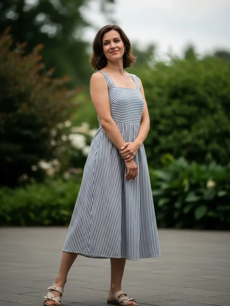 I like how effortless this dress feels. The stripes add interest without overpowering the look, and the length keeps it classy. It feels like a great option for a more laid back but still stylish wedding.