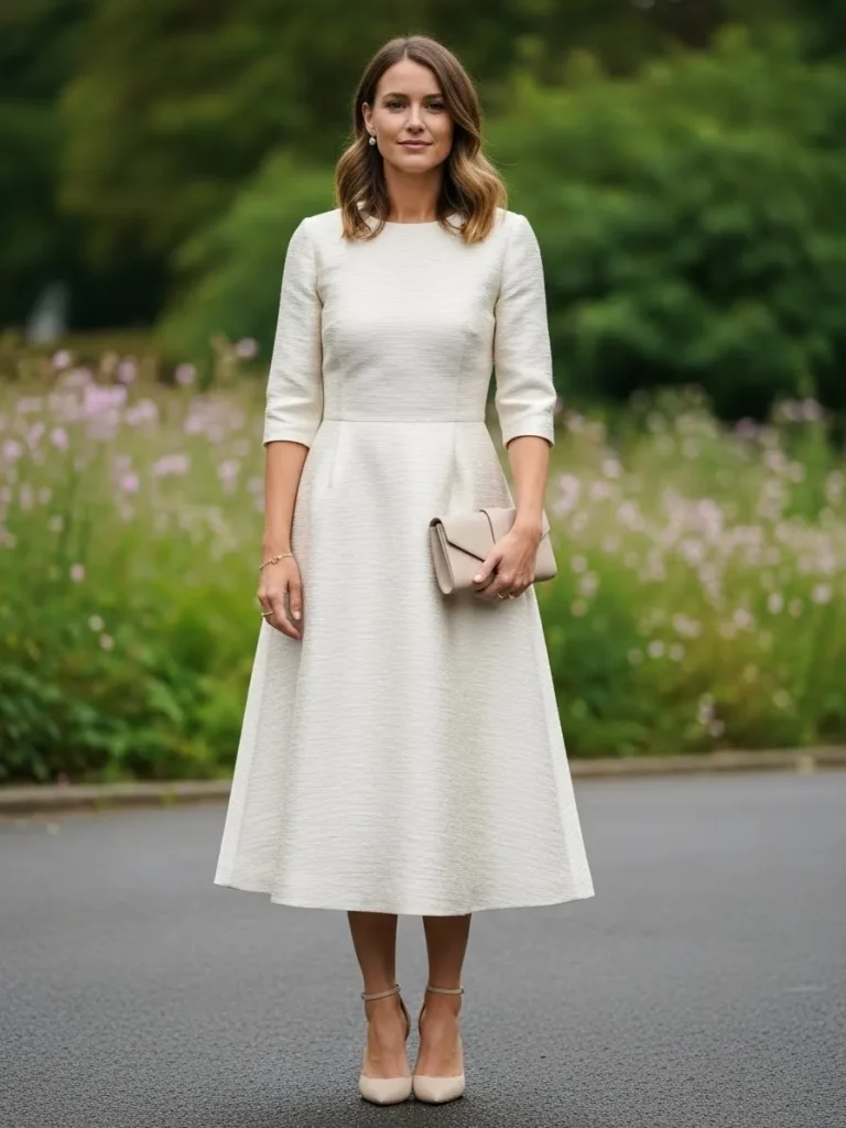 The dress is an ivory midi with a structured bodice, three quarter sleeves, and a gently flared skirt. The clean lines and simple design give it a refined and polished appearance.