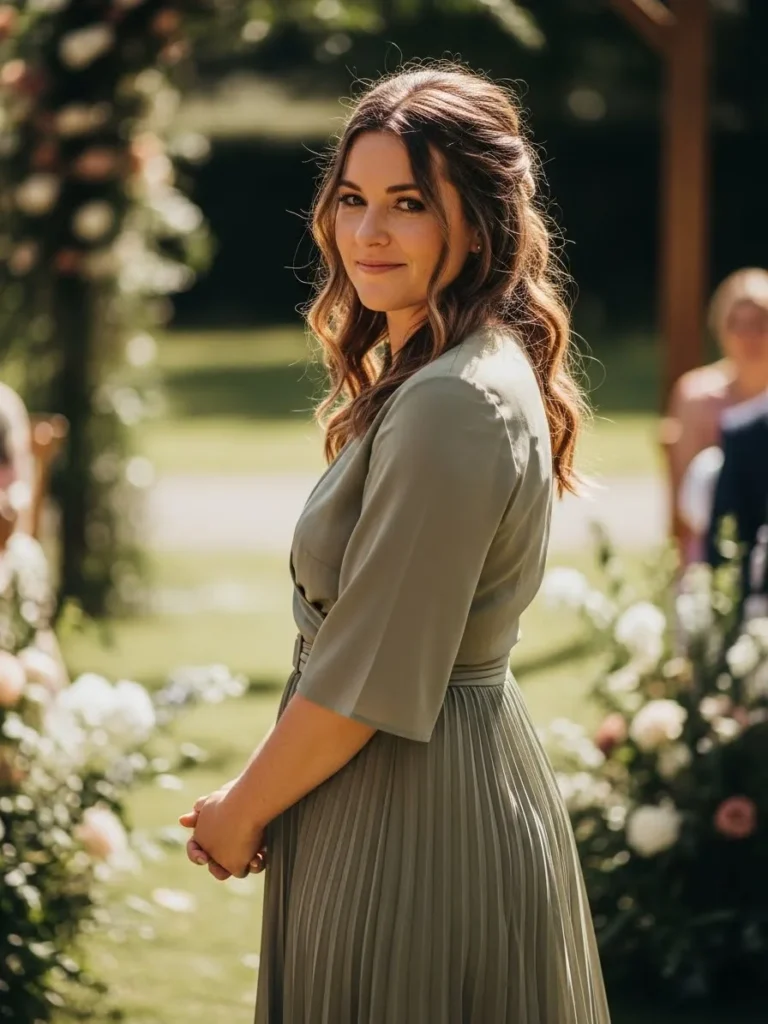 This look features a soft olive green dress with a gently pleated skirt and relaxed elbow length sleeves. The waist is lightly defined, and the flowing fabric gives the dress a graceful shape that feels calm and elegant in an outdoor setting.