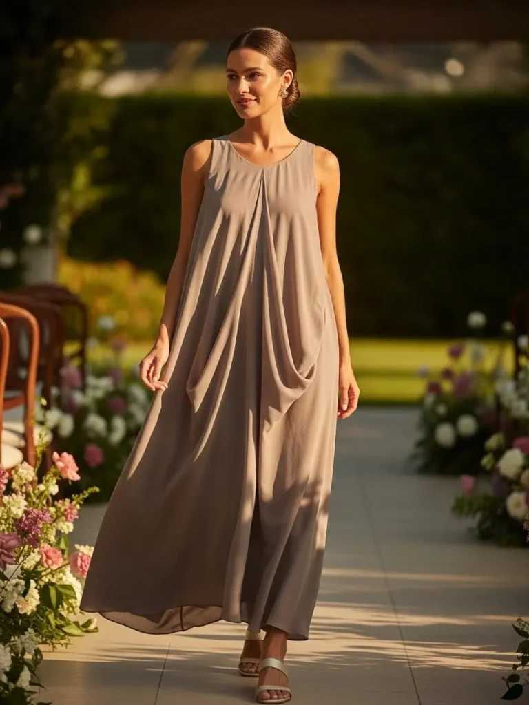 This outfit features a taupe maxi dress with a loose, flowing silhouette and a sleeveless neckline. The fabric drapes softly, creating movement and comfort without clinging to the body.
