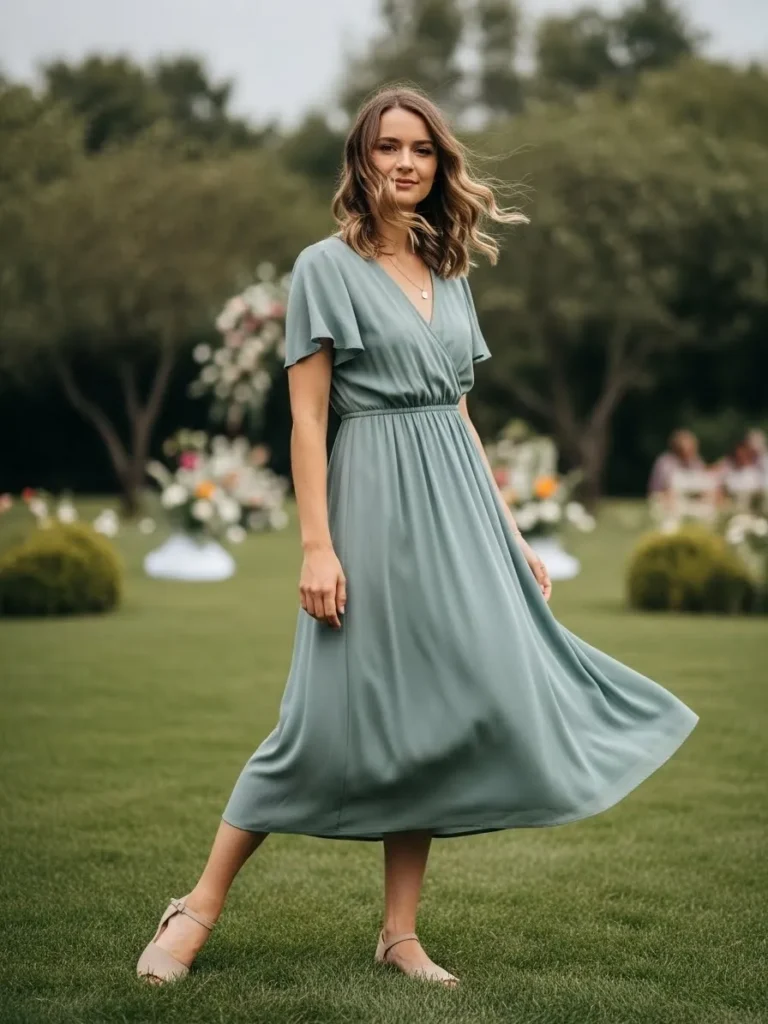 This look showcases a sage green midi dress with a lightly fitted waist and a skirt that flows gently while walking. The short sleeves and airy fabric make it perfect for an outdoor celebration.
