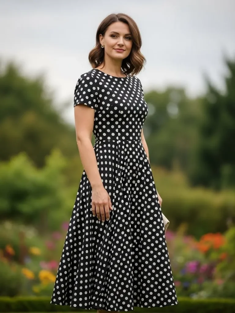 This dress features a black base with small white polka dots and a flowing midi length skirt. The fitted top balances the movement of the skirt, creating a timeless silhouette that feels playful yet refined.