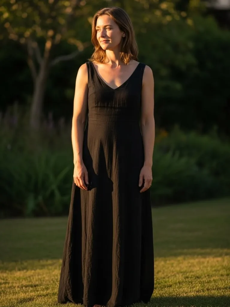 The outfit is a simple black sleeveless dress with a loose, flowing shape that skims the body without clinging. The deep neckline and lightweight fabric keep it seasonally appropriate, while the floor length cut gives it a refined and understated presence.