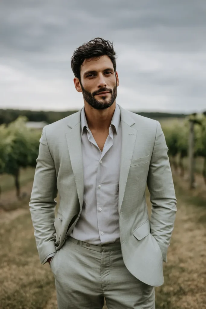 I am absolutely loving this departure from the traditional dark wedding suit. Choosing a muted green is such a stylish way to stand out while still feeling timeless and elegant. If you are planning a vineyard or garden wedding this color choice is a total winner because it blends so harmoniously with the natural surroundings. It feels incredibly fresh and breathable which is exactly what you want for a warm spring day. I think skipping the tie is a brilliant move that keeps the whole vibe approachable and chic.