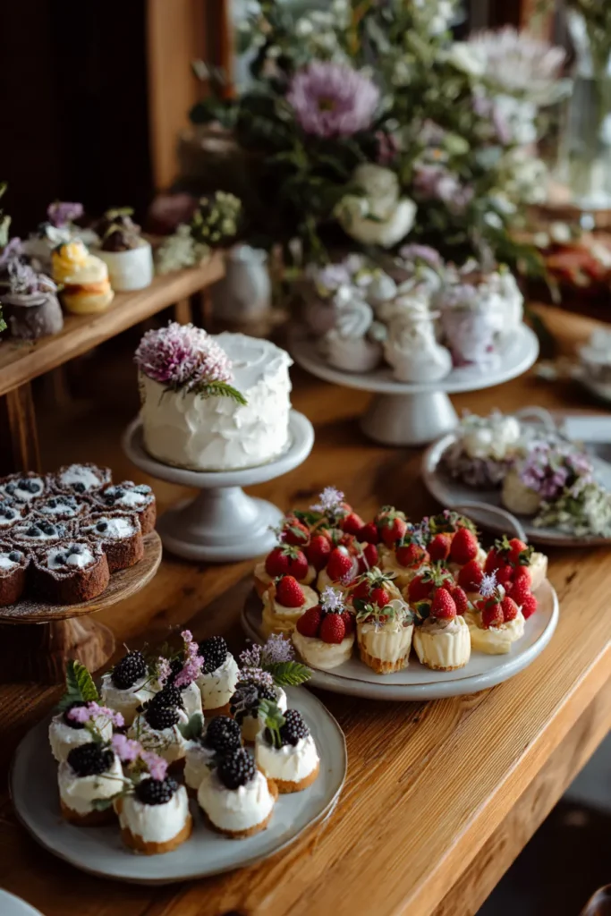 This dessert display features a stunning array of miniature treats and a charming small white cake topped with a vibrant purple flower. The spread includes delicate tarts piled high with fresh strawberries and tiny purple blooms alongside bite sized cheesecakes adorned with glossy blackberries and green leaves. There are also rich chocolate cups filled with cream and blueberries which are lightly dusted with powdered sugar for a finished look. Everything is beautifully arranged on rustic wooden stands and tiered platters to create a lush and inviting feast for the eyes.