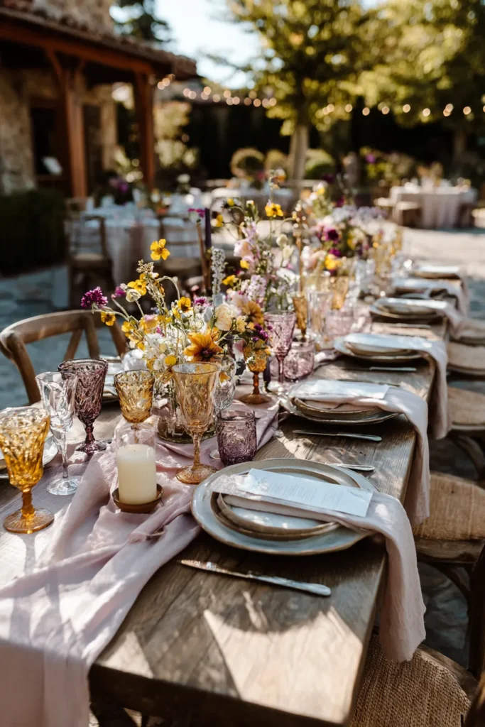 This long wooden banquet table is set for a dream garden reception. A soft dusty rose gauze runner flows down the center and acts as a base for vibrant wildflower centerpieces in shades of sunny yellow and rich purple. The places are set with textured stoneware plates and draped with matching light pink napkins. The real stars of the show are the vintage inspired glasses in amber and amethyst hues that catch the golden afternoon light perfectly.
