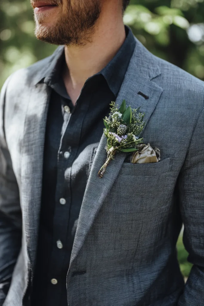 This groom look features a light grey textured blazer paired with a dark charcoal button down shirt. The standout detail is a dainty boutonniere made of miniature purple flowers and lush green sprigs tied together with rustic twine. A neutral silk pocket square is tucked neatly into the chest pocket which adds a subtle bit of shine against the matte fabric of the suit.