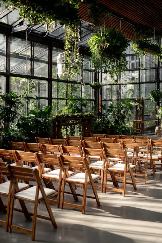 This ceremony space is located inside a breathtaking glass conservatory filled with an abundance of lush green plants and hanging foliage. The industrial black frames of the windows contrast beautifully with the organic textures of the ferns and tropical leaves. Rows of classic wooden folding chairs with crisp white cushions are perfectly aligned and catch the soft rays of sunlight streaming through the ceiling.