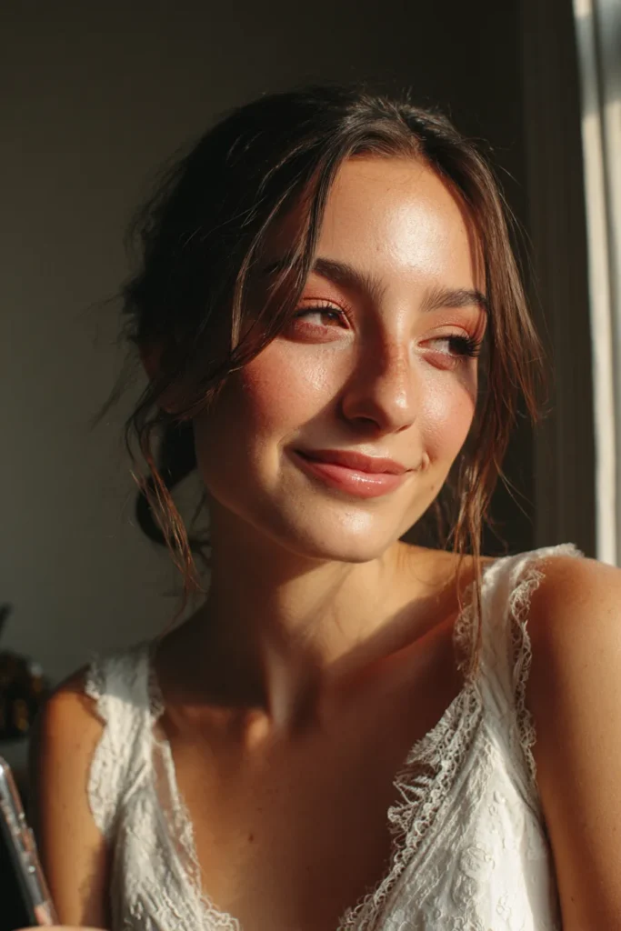 I am totally obsessed with this sun kissed makeup because it feels so effortless and perfect for a spring afternoon. Choosing warm terracotta and peach tones is such a smart way to look healthy and vibrant without feeling overdone. This style works so well because it enhances your natural beauty and lets your personality shine through. It is the ultimate inspiration for a bride who wants to look polished but still feel like herself while she celebrates under the golden sun.