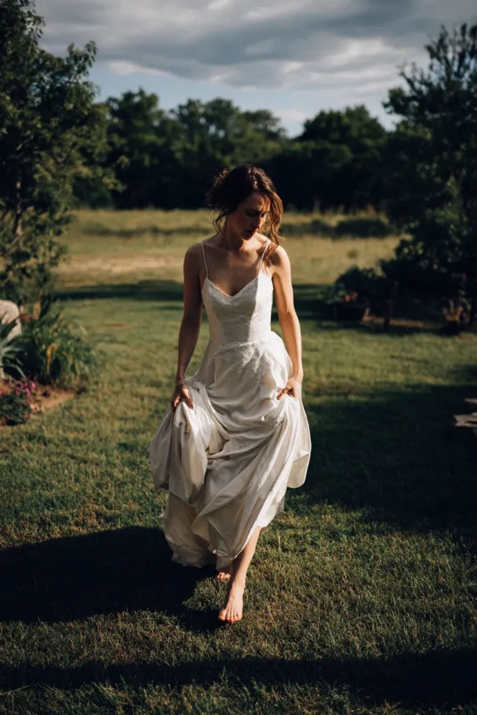 I am completely obsessed with how free and romantic this whole vibe feels. Going barefoot for a backyard or meadow ceremony is such a clever way to feel grounded and comfortable while still looking like an absolute dream. It is the perfect choice for a bride who wants to focus on the joy of the moment rather than fussing over high heels. I think the simplicity of the dress combined with the golden hour light makes for the most breathtaking and authentic wedding photos.