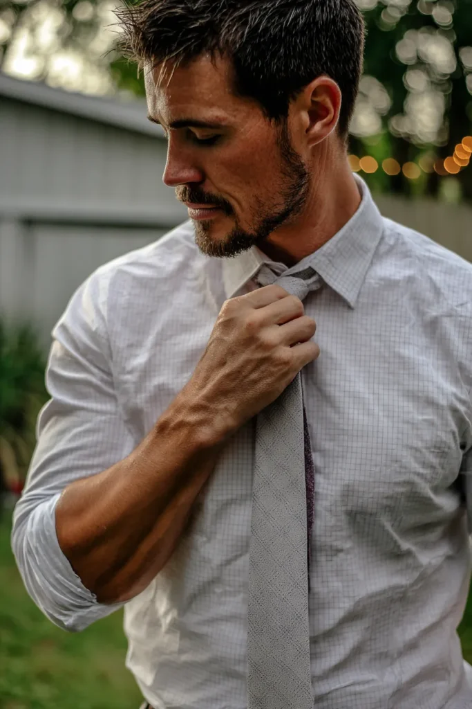 This groom is wearing a crisp white dress shirt featuring a subtle and modern grid pattern. He paired it with a light grey tie that has a rich woven texture and a soft matte finish. His sleeves are rolled up to the mid arm for a relaxed yet professional vibe and his short hair and beard are perfectly groomed. The overall look is polished but comfortable and is ideally suited for a breezy outdoor garden setting.
