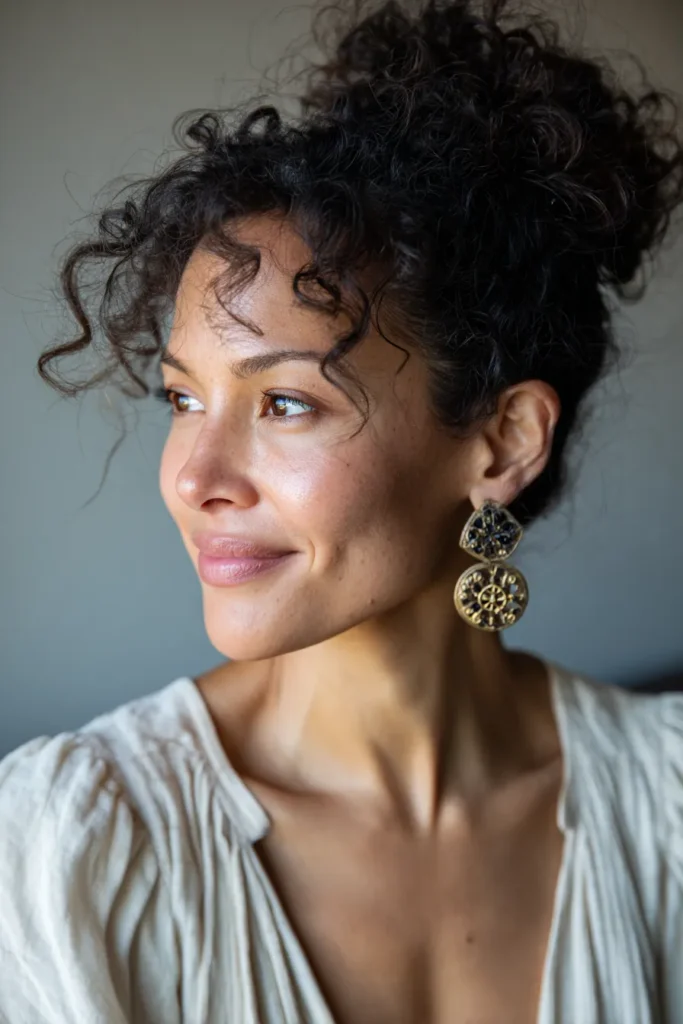 This bridal beauty look features natural dark curls swept up into a soft textured bun with several ringlets left out to frame the face. The model wears a cream colored blouse with delicate pleating and a deep neckline that feels both airy and organic. Her makeup is focused on a fresh and luminous glow with soft peachy tones on the cheeks and a natural glossy lip. The standout detail is a pair of bold tiered gold earrings with intricate black circular designs that add a touch of artistic flair to the ensemble.