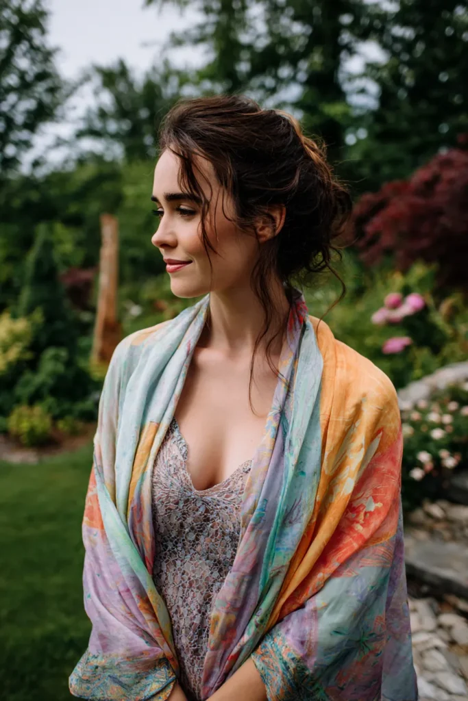 This stunning look features a delicate lavender lace gown paired with a large silk shawl in a vibrant watercolor print. The wrap includes a beautiful mix of warm sunset oranges, soft yellows, and cool blues and purples that resemble a hand painted masterpiece. Her dark brunette hair is styled in a loose and romantic updo with wavy tendrils left out to frame her face. Her makeup is understated and fresh with a focus on rosy cheeks and a soft berry lip color that perfectly complements the lush garden backdrop.