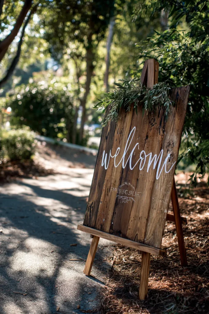 This beautiful welcome sign is made from dark stained wooden planks with a natural grain that adds a lot of character. The word welcome is hand painted in a graceful white script that really pops against the deep wood tones. A simple branch of fresh green olive leaves is draped across the top for an organic touch. It sits on a matching wooden easel right at the start of a sunny path where guests can easily see it upon arrival.