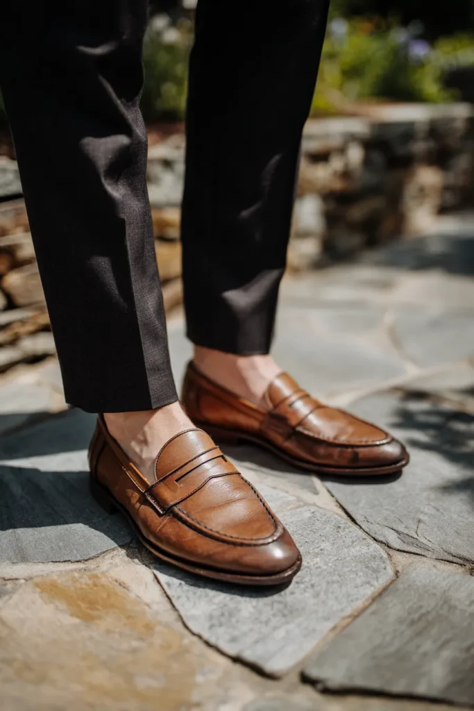 This groom is sporting a pair of sophisticated tan leather penny loafers with a beautiful burnished finish. He paired them with tailored dark trousers that are cropped perfectly at the ankle to show off the classic silhouette of the shoe without socks. The look is set against a rustic stone walkway and sunlit garden greenery which perfectly complements the warm tones of the leather.