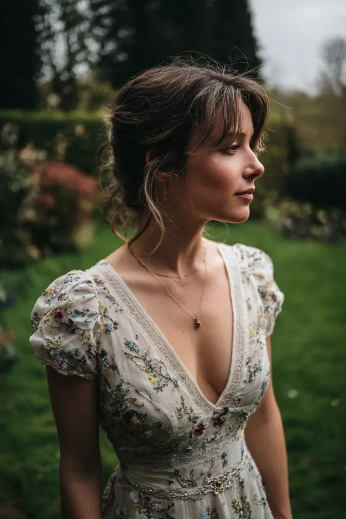 This look features a stunning white gown covered in delicate embroidered wildflowers in shades of blue yellow and pink. The dress has charming puff sleeves and a deep v neckline edged with intricate lace trim that adds a beautiful vintage feel. Her brunette hair is pulled back into a soft messy bun with full bangs and wavy tendrils framing her face perfectly. She paired the ensemble with dainty layered gold necklaces and kept her makeup very natural to highlight her glowing skin in the fresh garden setting.